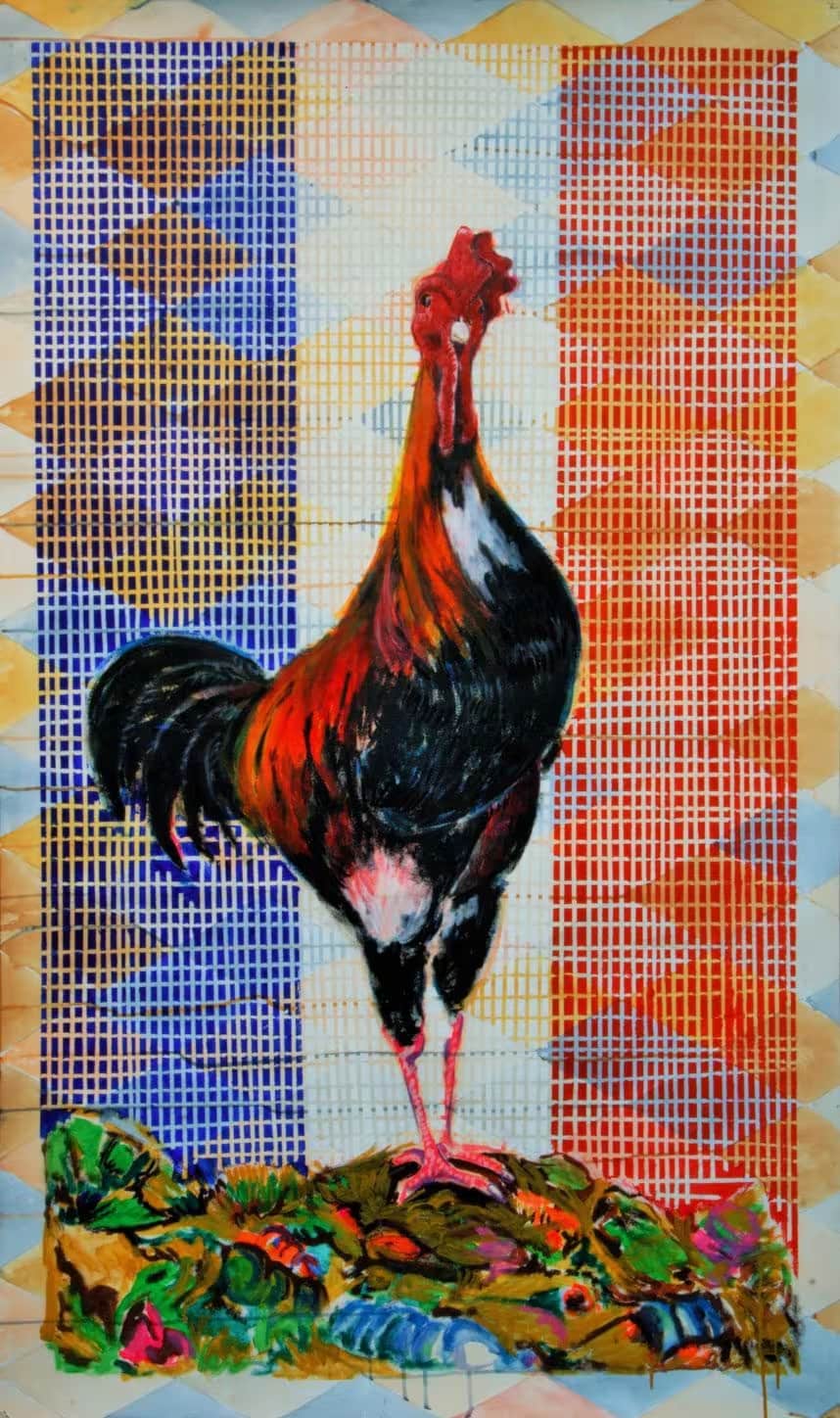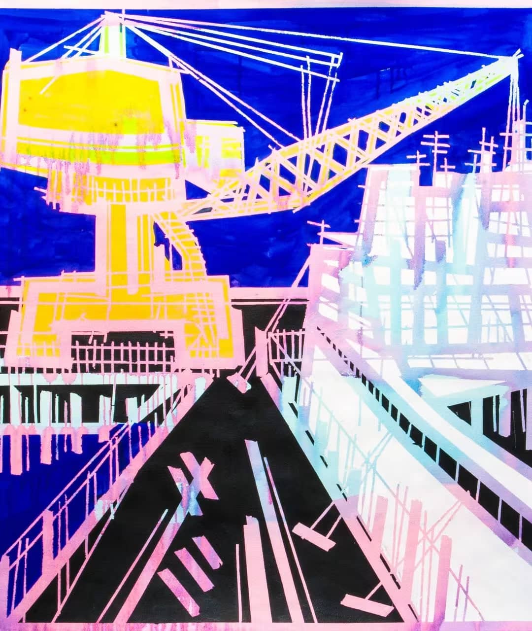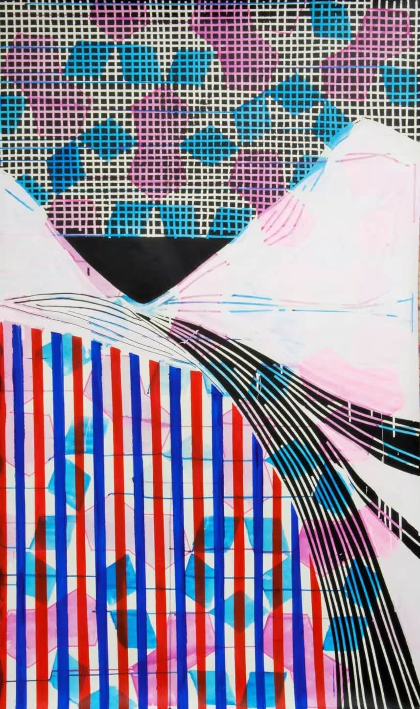Las escenas interiores que se vislumbran entre las líneas diagonales blancas y negras crean una profundidad sorprendente. Entre efectos cinéticos e intrigantes perspectivas, Builder de Baptiste Laurent nos transporta a un mundo onírico que mezcla la estética de las colgaduras bereberes con los balcones de Matisse y los grabados de Hokusai.