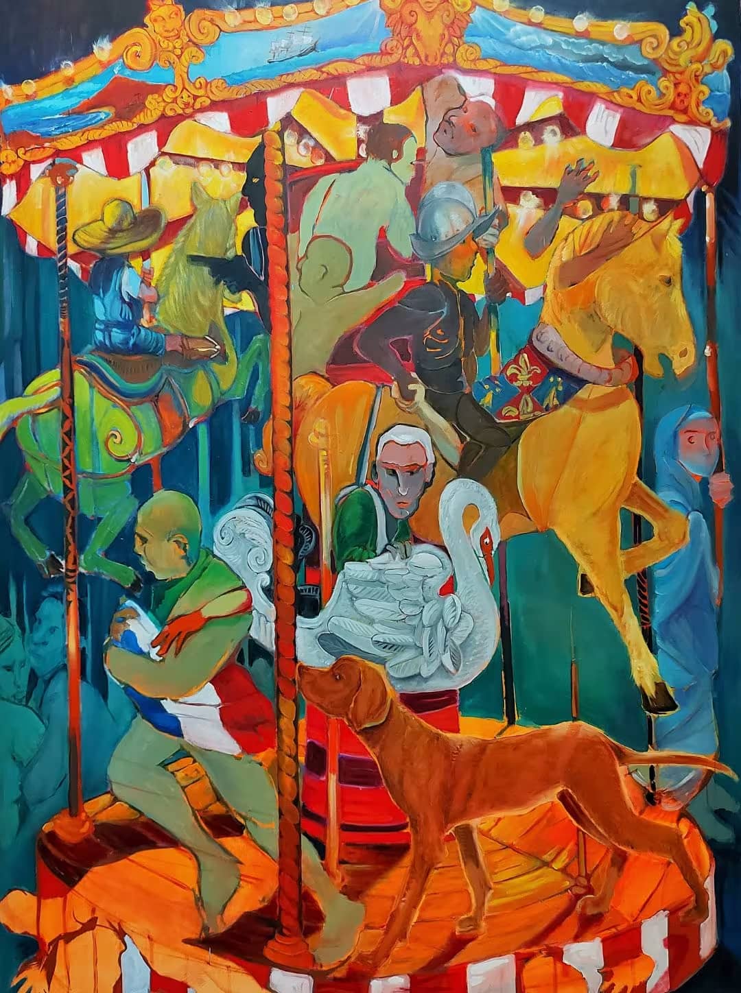 El tiovivo, símbolo de la infancia, se repite como un leitmotiv en la obra de Laurent, representado de diferentes formas, tanto alegres como inquietantes. Los caballitos de madera giran sobre sí mismos, montados por pequeñas figuras que parecen suspendidas en el tiempo. El movimiento circular del tiovivo se convierte en una metáfora de la repetición y los sueños, pero también de la ilusión de libertad.